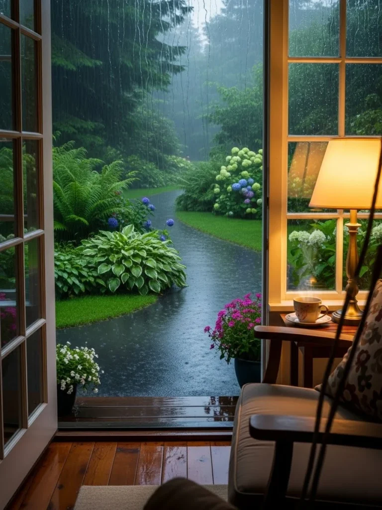 The vibe is cozy, contemplative, and peaceful. It evokes the smell of rain on hot asphalt and soil. It’s a perfect moment for reading a book or just watching the weather from a comfortable vantage point.