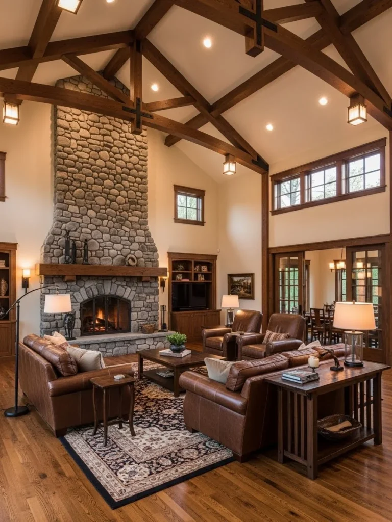 This image exemplifies the concept of “rustic luxury.” It demonstrates how expansive interior architecture can be made cozy through the use of natural materials and thoughtful interior design. It is the ultimate gathering space for family and friends, balancing impressive aesthetics with deep comfort.