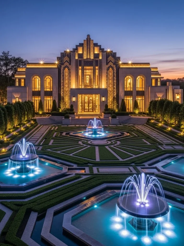 The mansion stands bold and glamorous, defined by sharp lines, symmetry, and striking proportions. Its façade reflects classic Art Deco elegance, combining luxury with confident architectural rhythm.