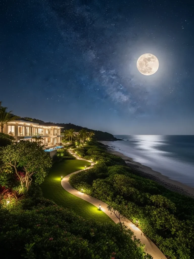 The villa stretches along the shoreline, its white walls reflecting moonlight. Open terraces face the sea, allowing ocean air to flow freely through the space. The architecture feels relaxed yet refined.