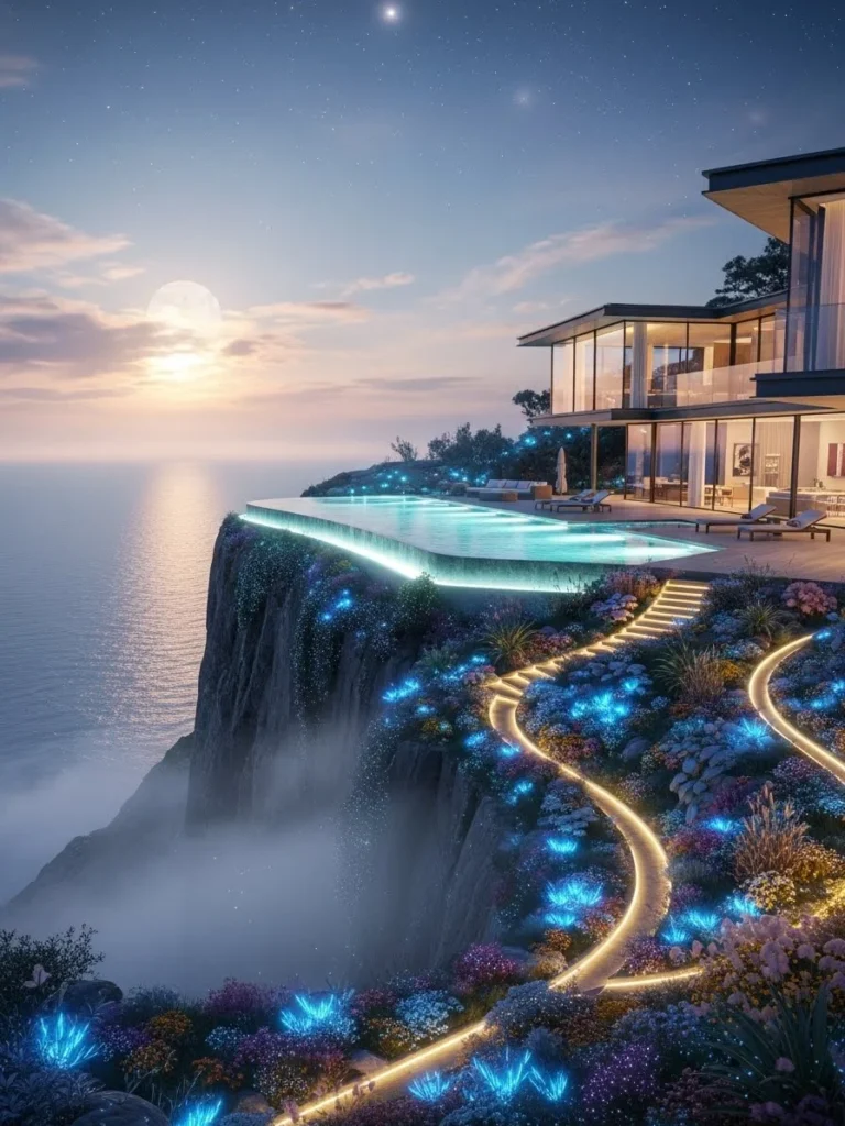 As night deepens, the house becomes radiant against darkness. This futuristic estate defines luxury through possibility—a dream of tomorrow shaped by light, form, and floating beauty.