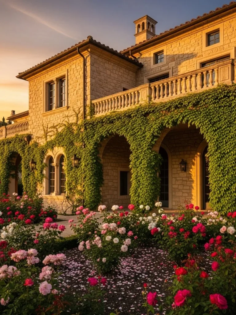 Elegant Mediterranean Mansion With Roses And Golden Sunlight