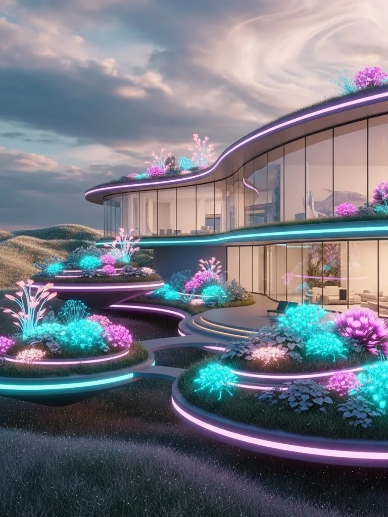 The house appears suspended, its sleek form defying gravity. Smooth surfaces and glowing accents define its futuristic presence. Architecture feels light, precise, and visionary.