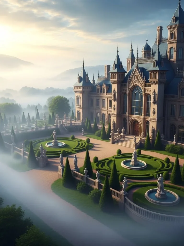 Gardens stretch outward in gentle layers, blending formal hedges with open lawns and flowering borders. Dew clings to leaves and petals, catching faint glimmers of light. Ancient trees frame the property, their silhouettes fading into mist.