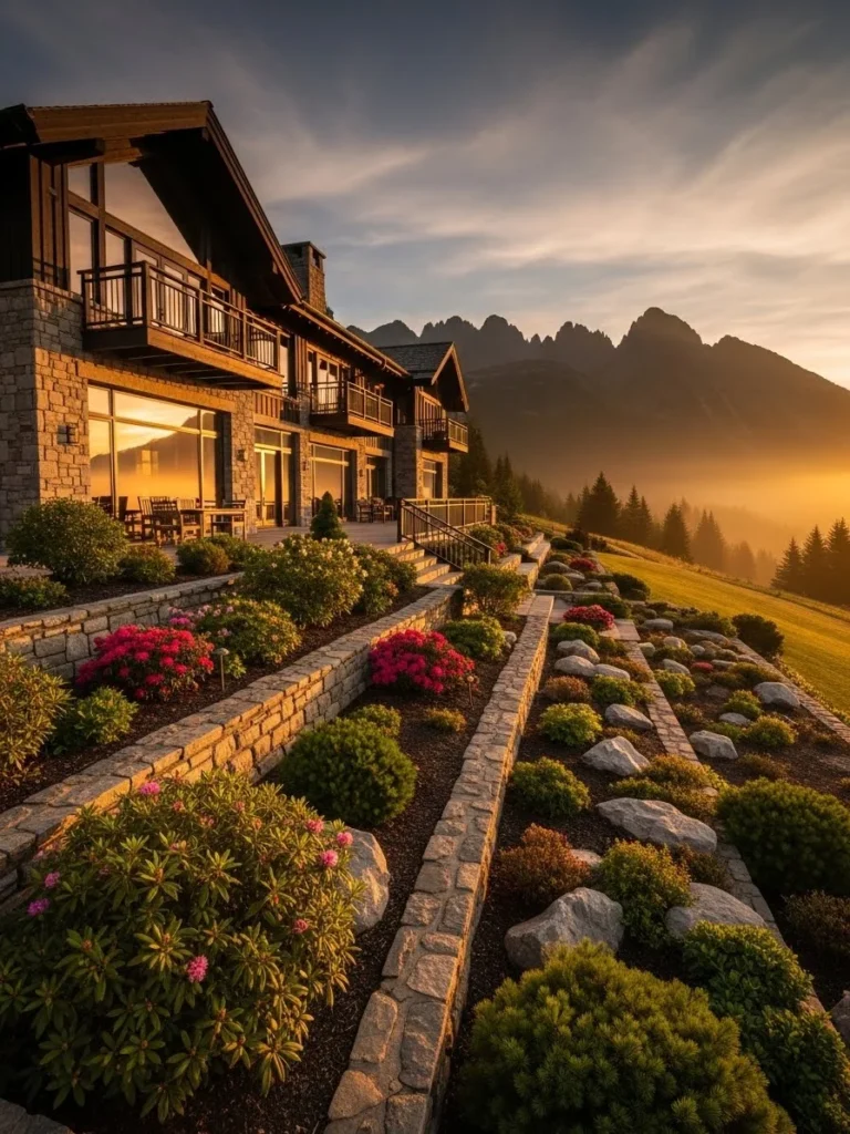 Terraced alpine gardens descend the hillside, filled with hardy plants and flowering perennials. Stone walls define each level, creating rhythm and stability. The garden mirrors the mountain’s form.