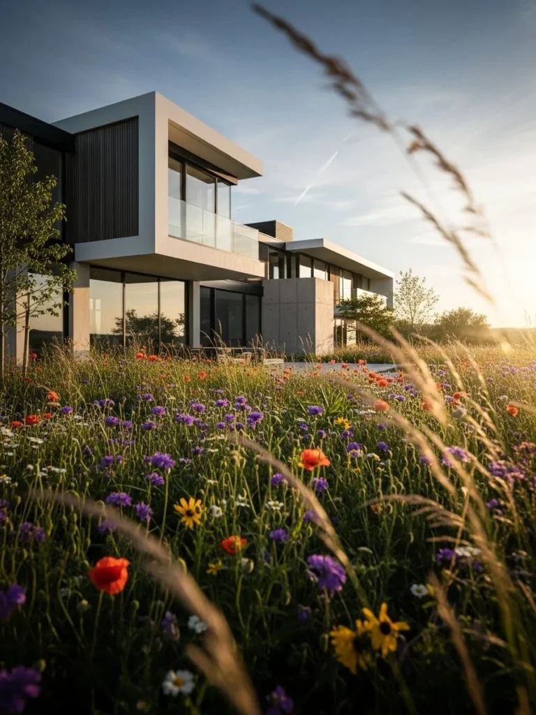 The home stands with quiet confidence, its modern form softened by surrounding nature. Clean architectural lines contrast gently with the movement of tall grasses and flowers. The structure feels grounded, not imposing.