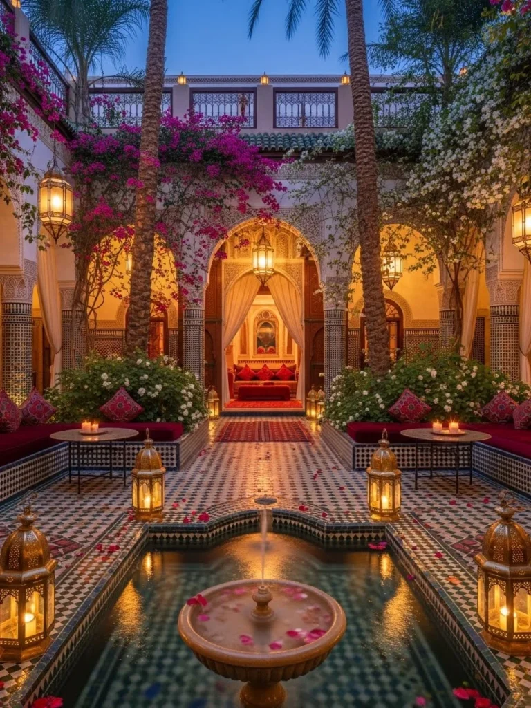 As lanterns glow in the evening, the riad becomes deeply atmospheric. This luxury space is defined by enclosure and beauty—a timeless Moroccan sanctuary where water, shade, and craftsmanship create calm elegance.