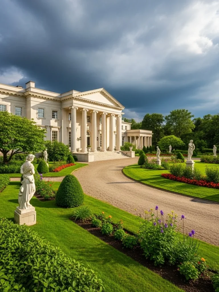 The mansion stands with commanding elegance, defined by tall white columns and balanced proportions. Its façade reflects classical ideals of order, strength, and beauty. The architecture feels enduring and formal.