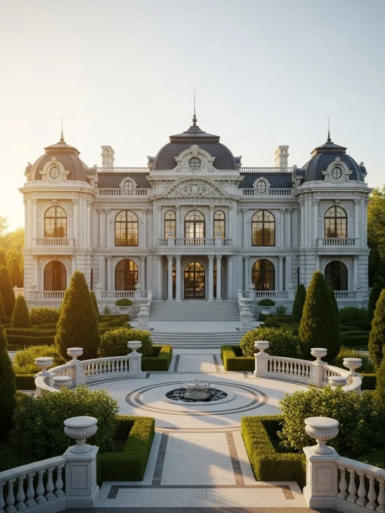 As the sunrise bathes the estate in golden hues, the palace and gardens feel alive yet eternal. This royal-style luxury residence celebrates grandeur, precision, and beauty—a majestic retreat where classic architecture meets dreamlike garden landscapes in perfect harmony.