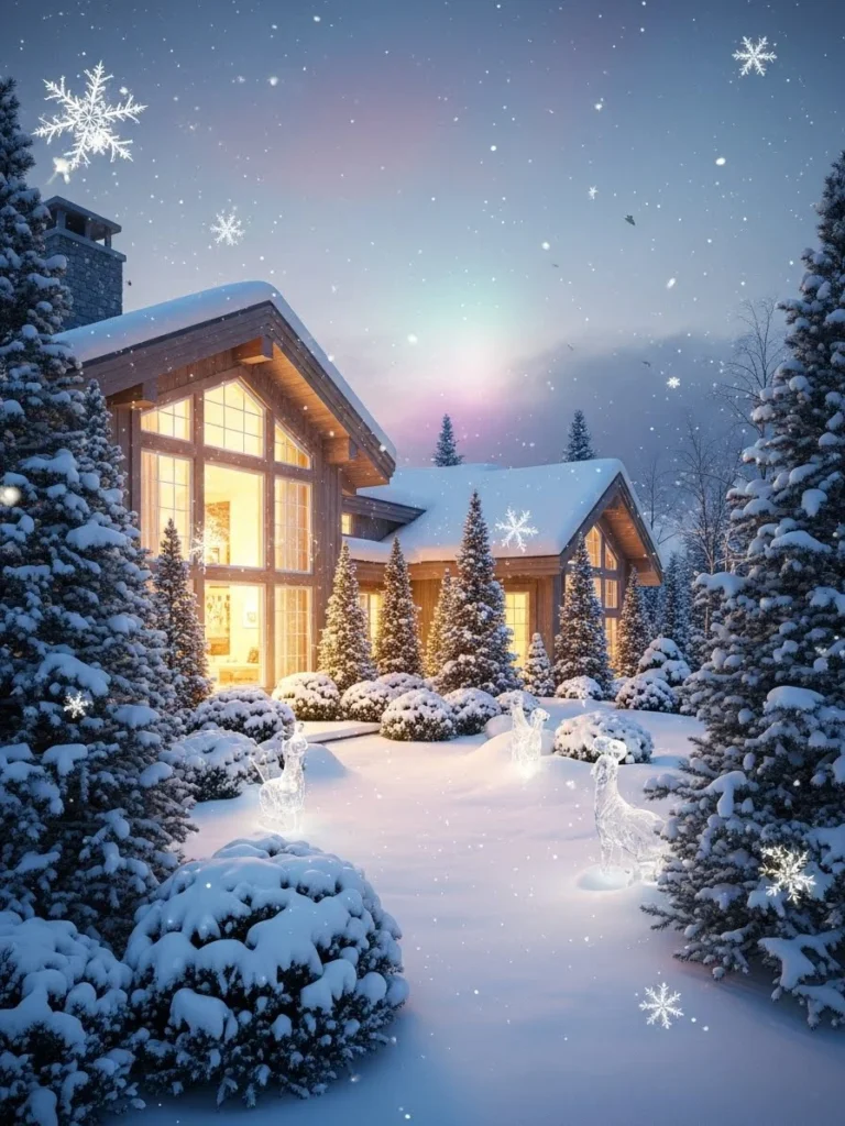 Snowy Luxury Chalet With Glowing Windows And Evergreens