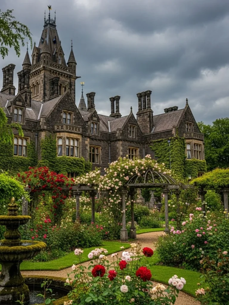 A rose garden unfolds before the mansion, bursting with color and fragrance. Climbing roses wind their way up stone walls, while neatly arranged beds display shades of blush, crimson, and ivory. Gravel pathways crunch softly underfoot, guiding visitors through this romantic landscape.