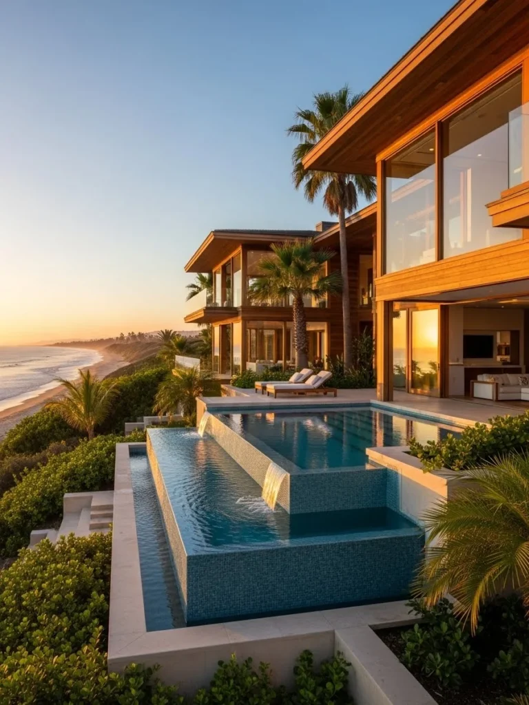 Designed for dramatic coastal settings, this mansion embraces verticality. Multiple pool levels cascade toward the ocean, creating movement and visual depth across the property.