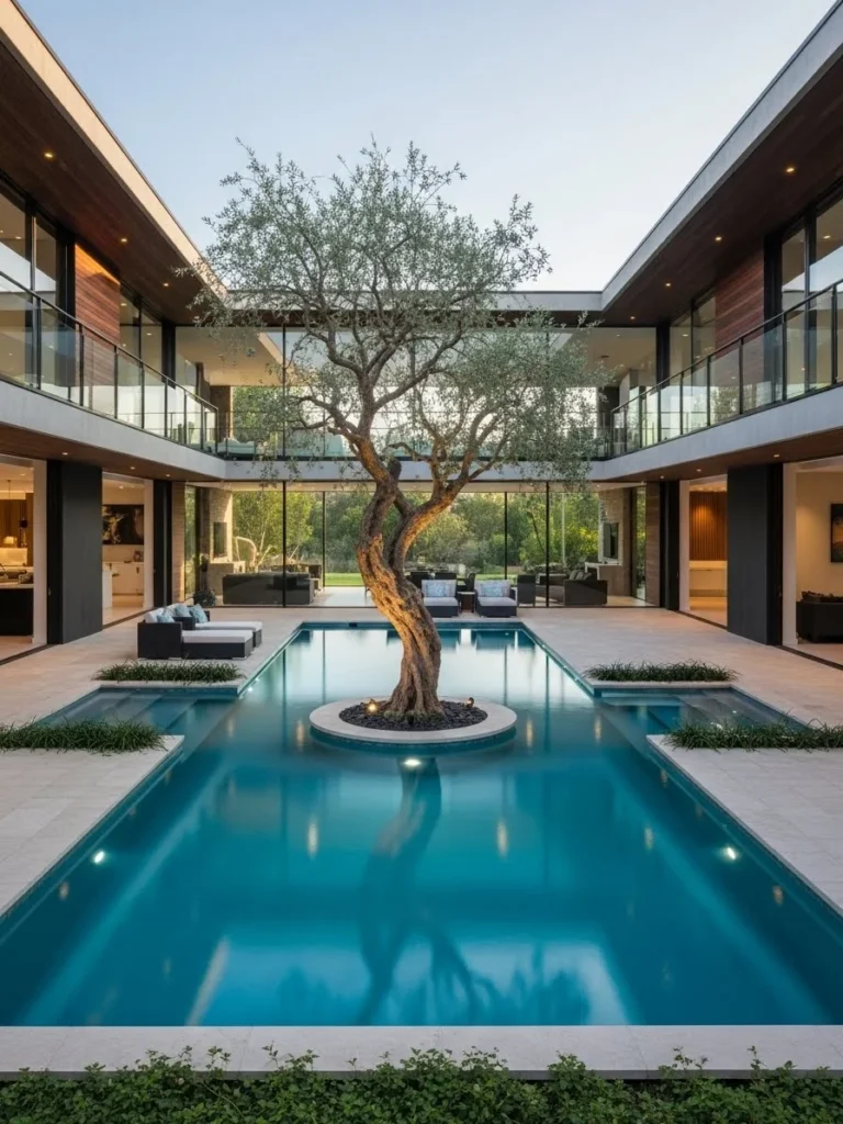 Contemporary Courtyard Mansion Centered Around Sculptural Tree Pool