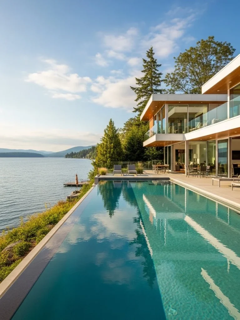 The pool aligns visually with the lake, making boundaries almost invisible. Reflections enhance the illusion.