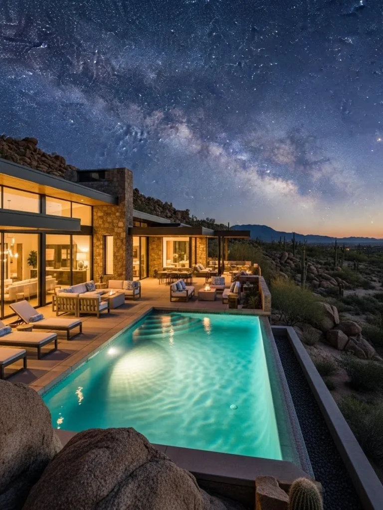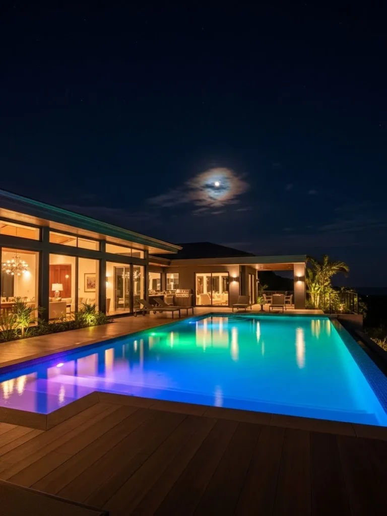 Under the stars, the pool becomes a quiet oasis. Luxury here feels expansive, private, and deeply atmospheric.