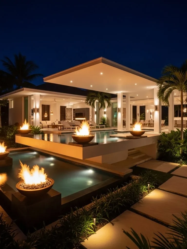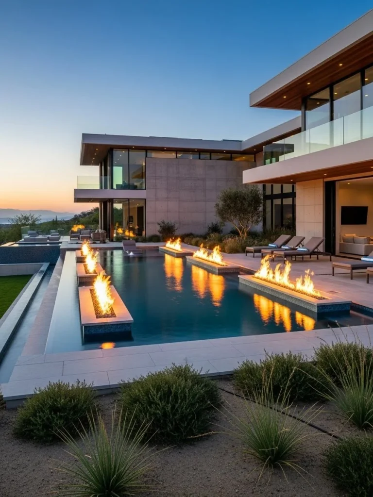 The pool incorporates fire bowls at key points, adding warmth and contrast. At night, reflections of fire and water create a dramatic yet controlled effect.