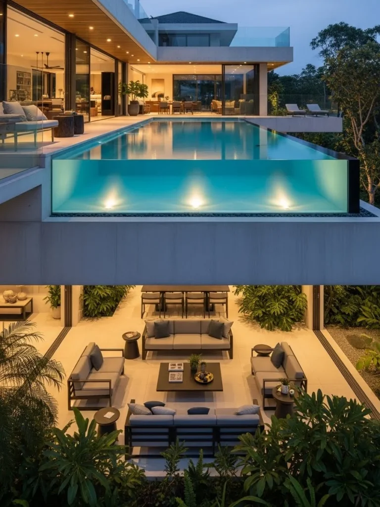 Glass Bottom Pool Mansion Suspended Above Outdoor Lounge