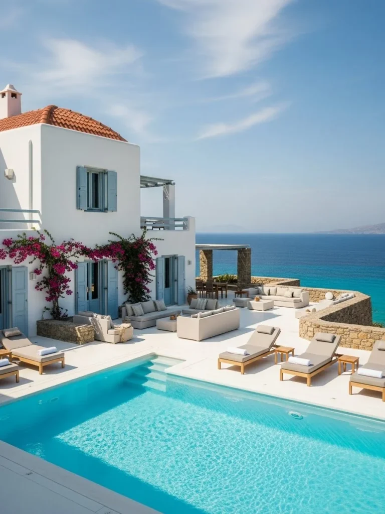 This villa captures the essence of Greek island living through simplicity and light. Whitewashed surfaces reflect sunlight, keeping spaces cool and bright.