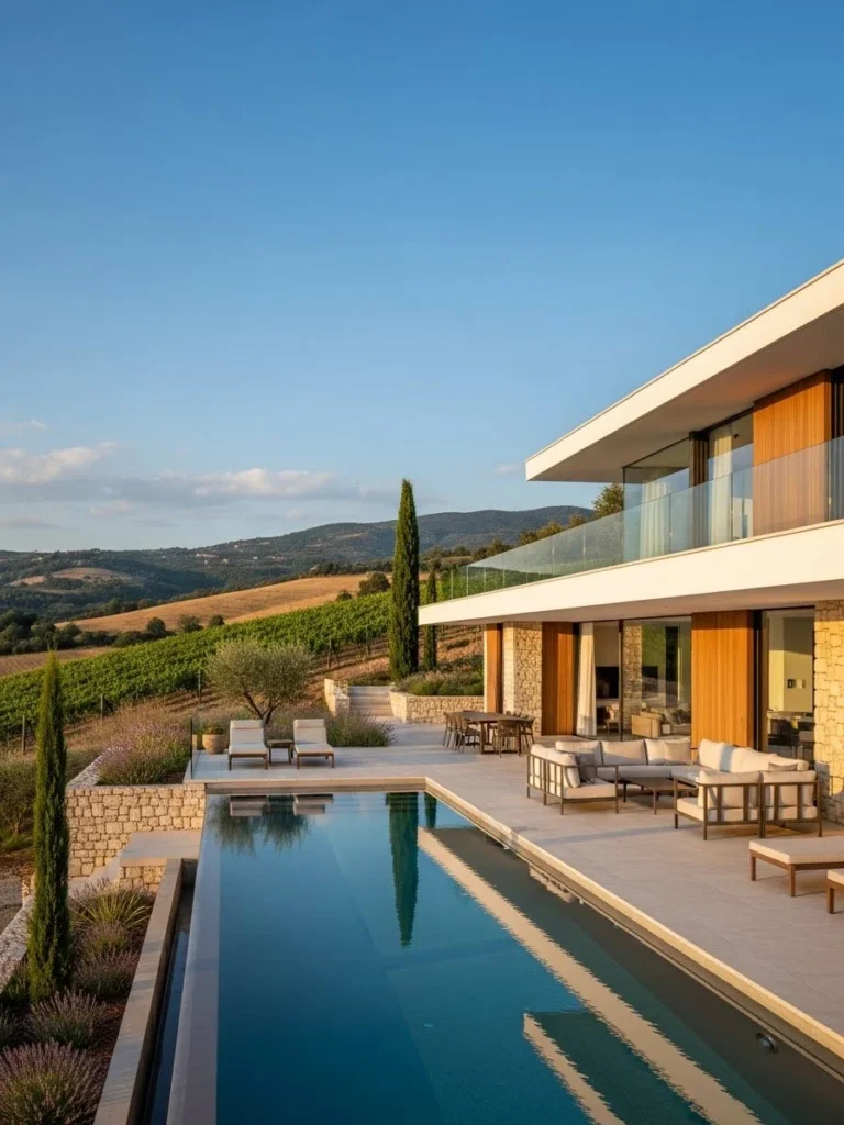Positioned above rolling vineyards, this villa is designed to celebrate its setting. Low-profile architecture ensures the landscape remains the primary focus.