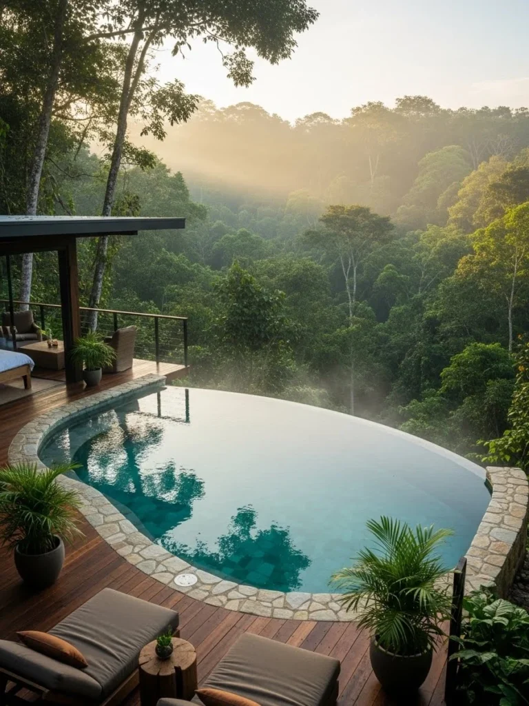 Mist and foliage surround the pool in the morning. Luxury here is immersion in nature with modern comfort.