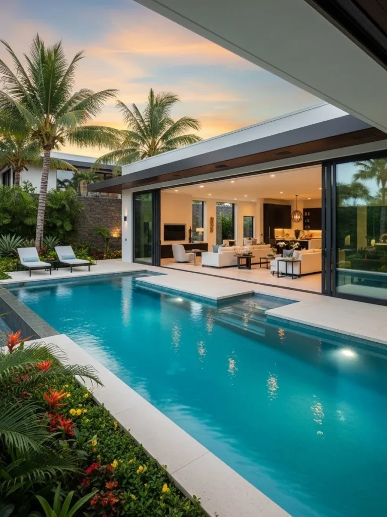 Designed for ultimate indoor-outdoor integration, this home eliminates visual barriers. The pool begins exactly where the living room ends, with water level flush to the interior floor.