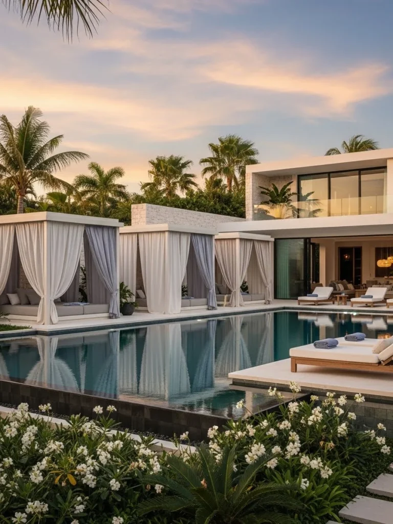 As sunset approaches, the pool reflects the sky’s changing colors, creating a cinematic atmosphere. Soft lighting integrated into the architecture ensures the villa glows at night, making the entire property feel effortlessly exclusive.
