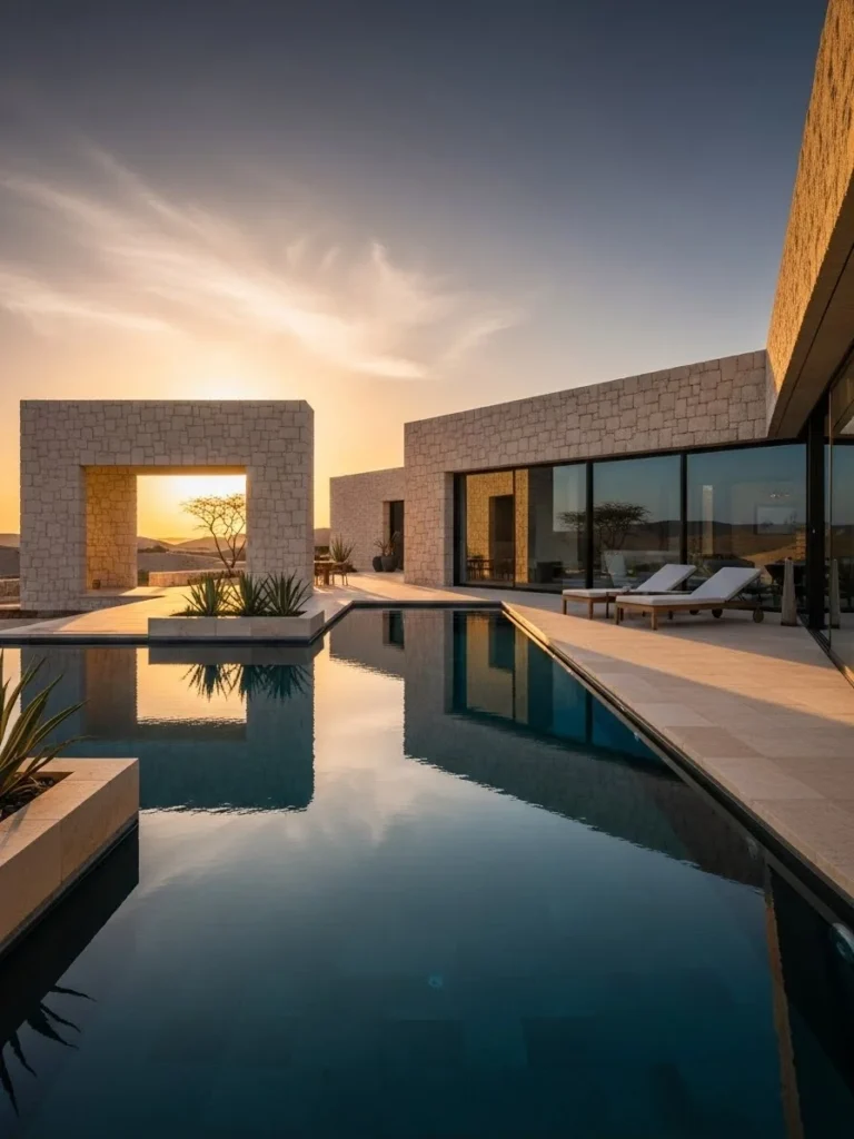 Designed for arid landscapes, this desert villa uses form and material to harmonize with its environment. Sand-colored stone walls and low-profile architecture keep the structure grounded and understated against the open terrain.