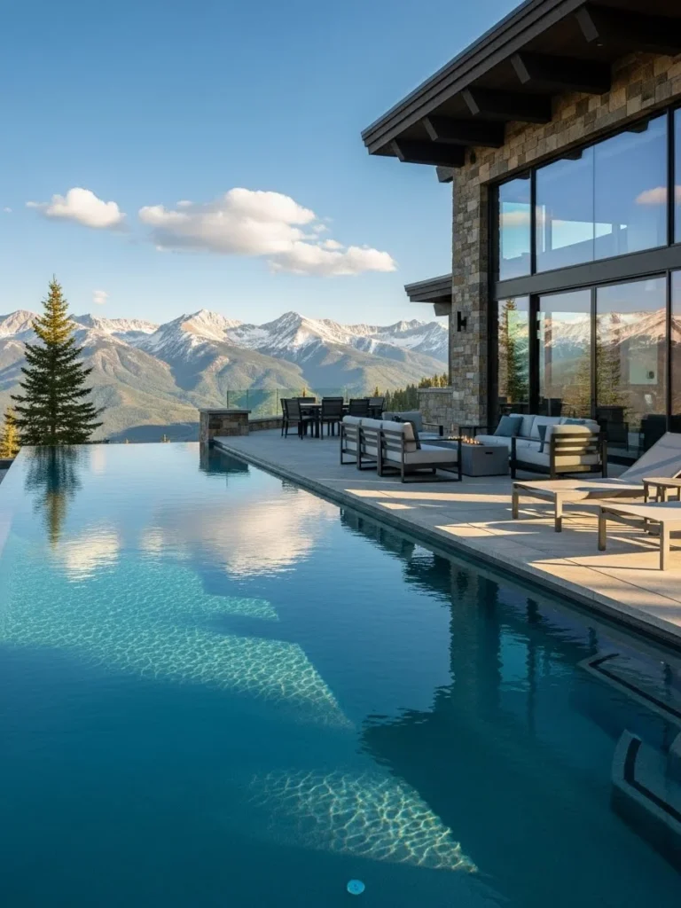 The infinity pool faces snow-covered peaks, creating dramatic contrast between warm water and cold landscape.