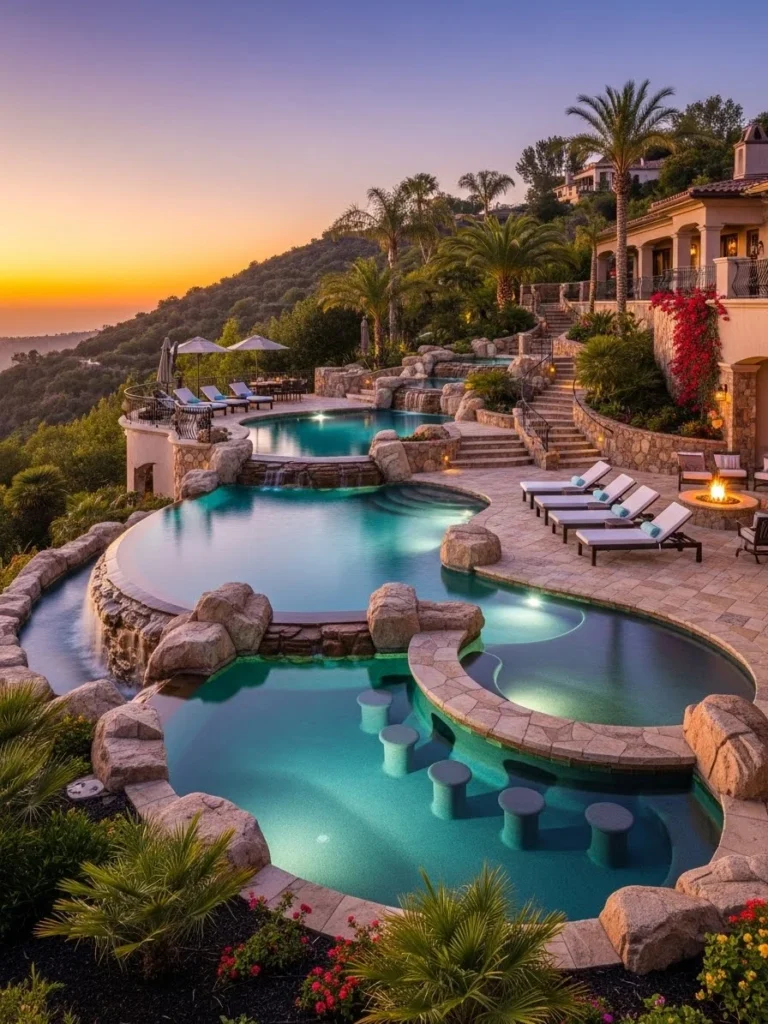 Each pool tier serves a different purpose, from lounging to swimming. Natural stone connects the levels, reinforcing continuity while allowing water to flow naturally downward.