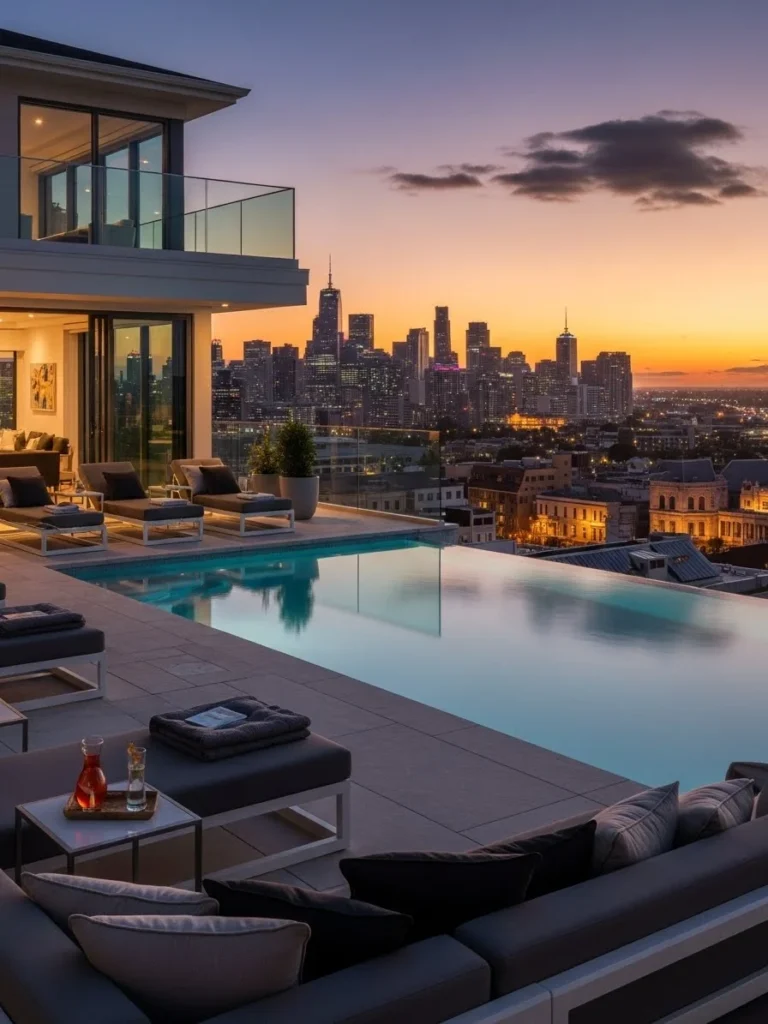 The rooftop infinity pool is the defining feature. Its edge aligns perfectly with the horizon of skyscrapers, creating the illusion that the city itself is floating beyond the water. Glass railings ensure uninterrupted views in every direction.