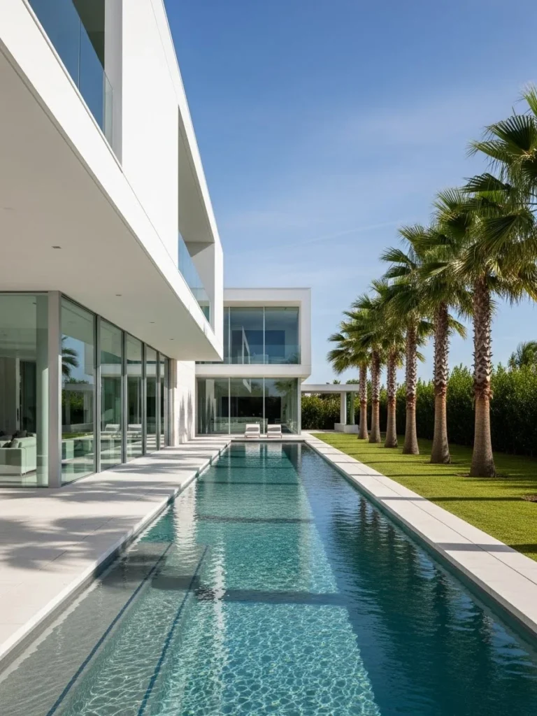 White Contemporary Estate With Linear Palm Framed Lap Pool