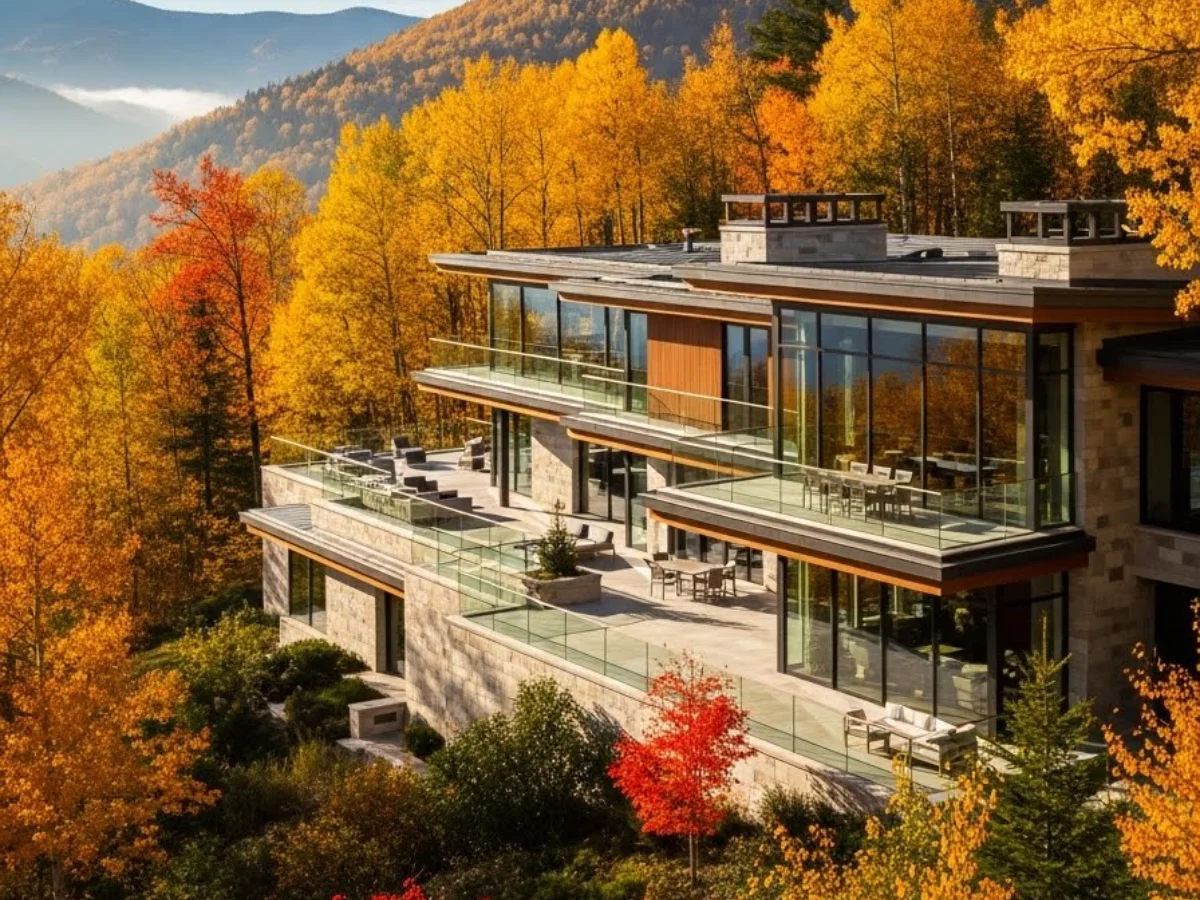Modern architecture defines the exterior, with clean lines and expansive terraces overlooking the colorful canopy. Natural materials complement the autumn palette, enhancing realism and harmony with the landscape. The home feels integrated rather than imposed.