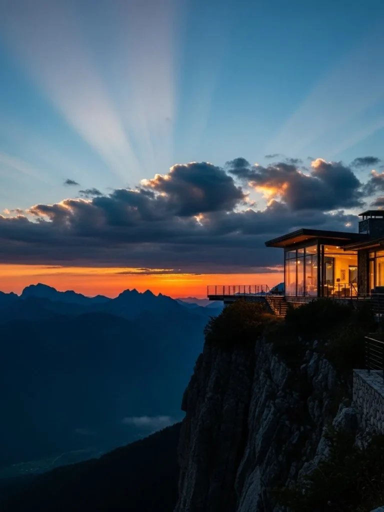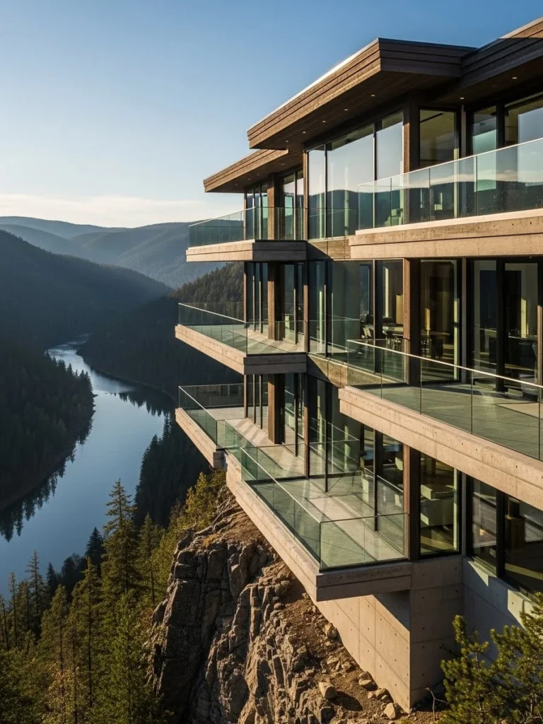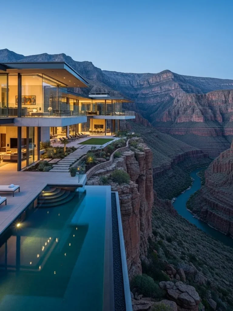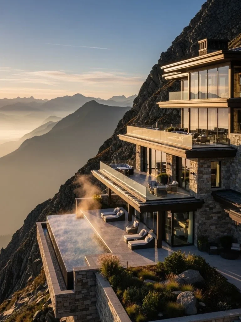 This dramatic cliffside luxury mansion is positioned boldly along a steep mountain edge, creating a striking visual presence against the vast landscape. Its sleek, modern design emphasizes openness and scale, with expansive glass walls framing endless mountain horizons. The mansion feels powerful, exclusive, and architecturally daring.