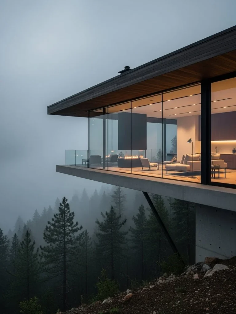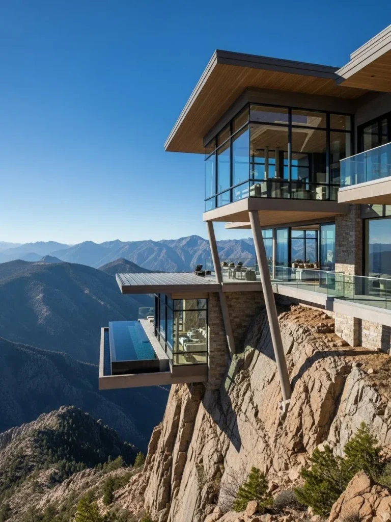 This dramatic cliffside mountain mansion features bold cantilevered overhangs that extend confidently over rugged terrain. The design is striking and modern, emphasizing architectural ambition and precision. The mansion feels daring and exclusive.