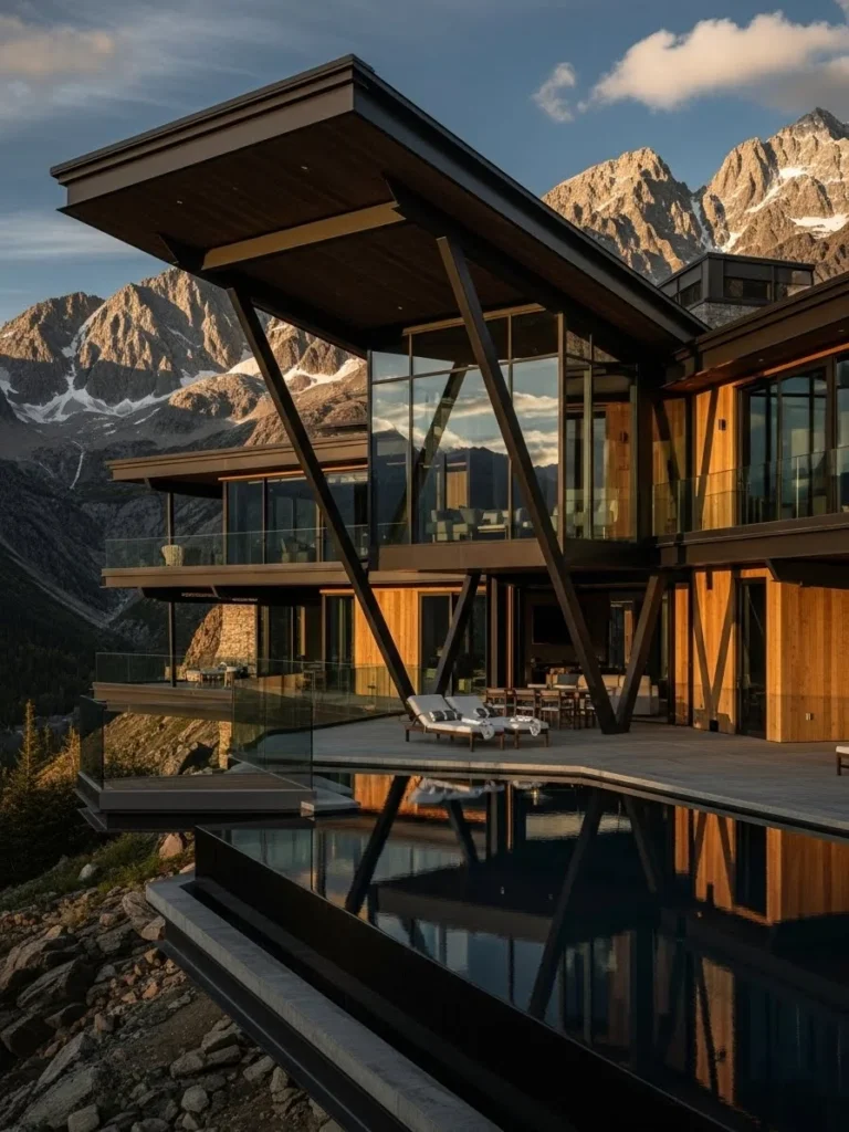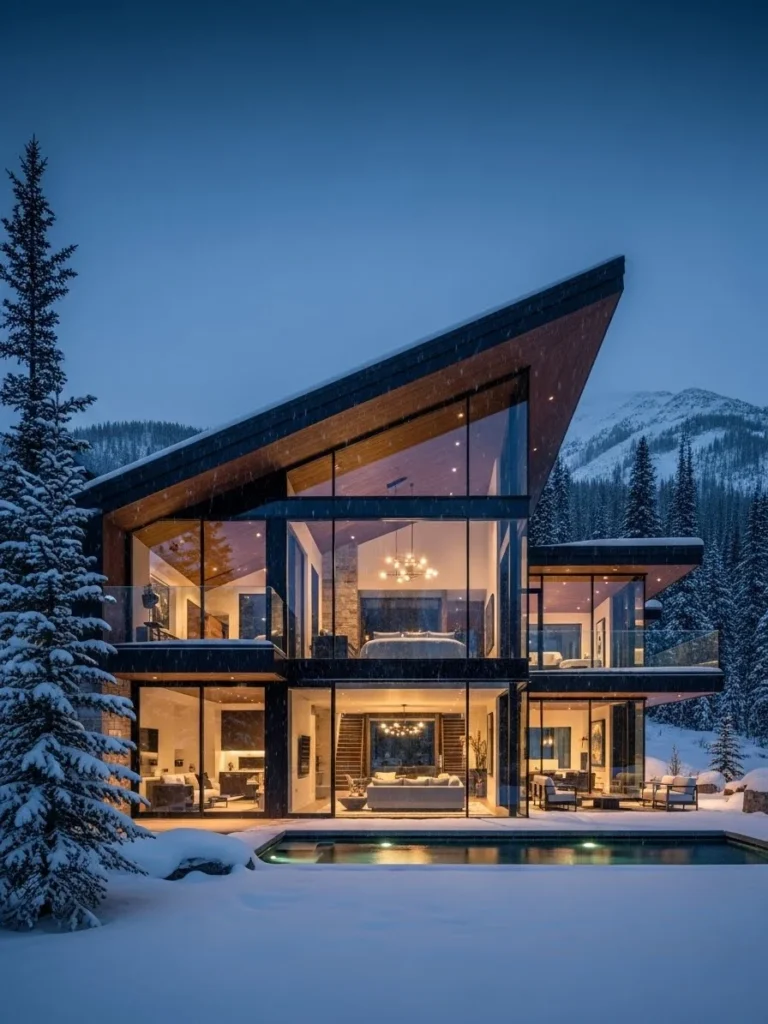 This contemporary sculptural mountain estate is defined by bold architectural forms and reflective glass surfaces. The structure feels artistic and modern, standing as a sculptural presence against the natural landscape. The design is expressive yet refined.