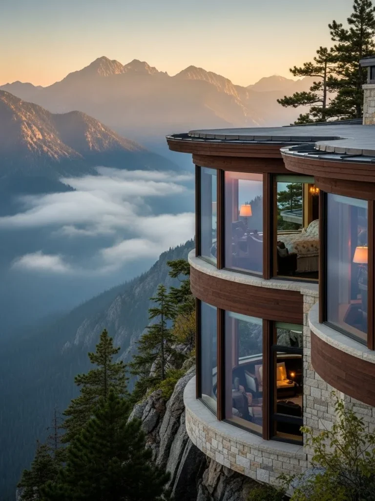 This curved architectural mountain mansion introduces fluid design into a rugged landscape. Smooth, flowing lines soften the structure’s presence, allowing it to harmonize with rolling terrain. The mansion feels modern, artistic, and naturally integrated.