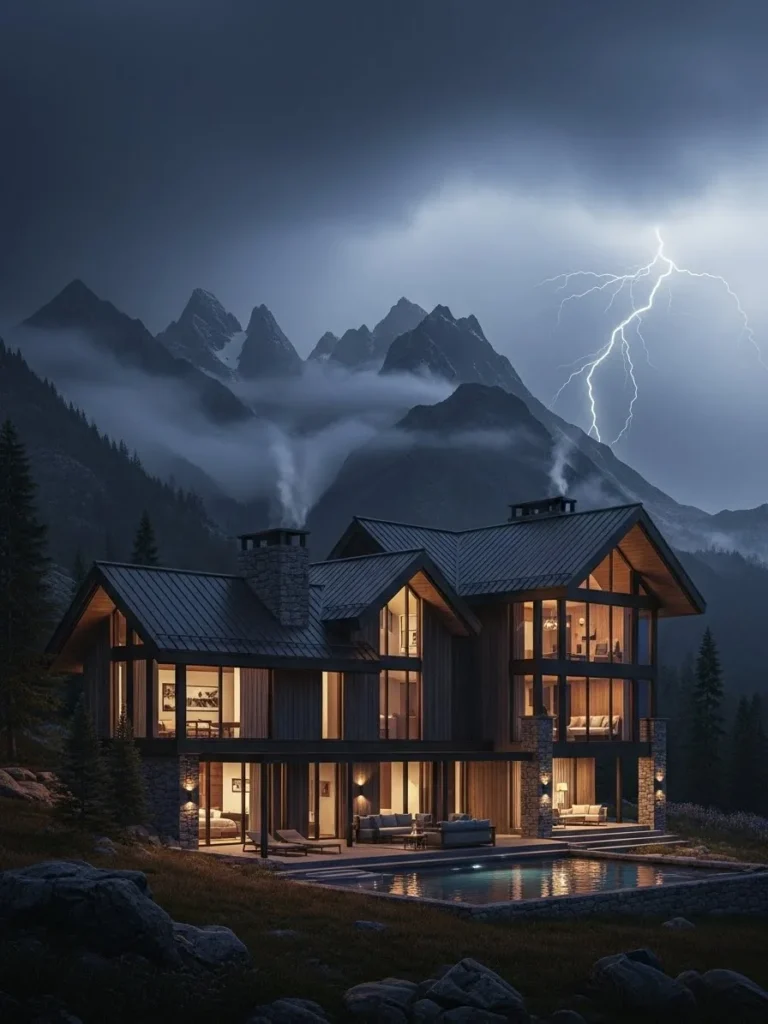 As clouds move across the peaks, the mansion remains calm and commanding. The scene captures luxury in its most dramatic form—bold, atmospheric, and unforgettable.