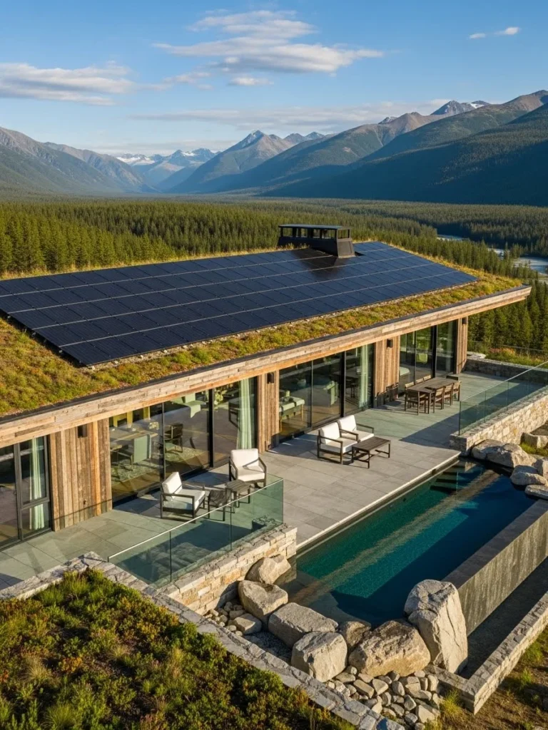 A green roof blends the structure into the mountainside, while solar panels and natural materials enhance efficiency. Stone, wood, and glass create a realistic and harmonious exterior. The home appears both innovative and grounded.
