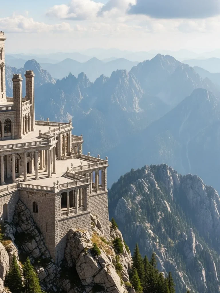 This grand mountain palace is defined by its commanding presence and classical architectural elements. Tall stone columns, wide balconies, and symmetrical design create an impression of timeless luxury. The palace overlooks vast mountain ranges, reinforcing its sense of scale and prestige.