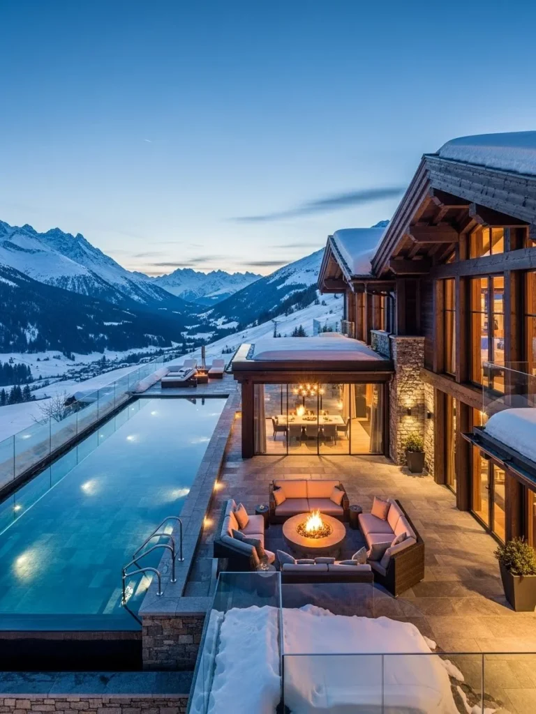 This Swiss-inspired luxury mountain mansion draws from classic alpine architecture while embracing modern refinement. Steep rooflines, natural wood, and stone elements give the structure a timeless presence among snow-covered peaks. The mansion feels warm, elegant, and rooted in tradition.