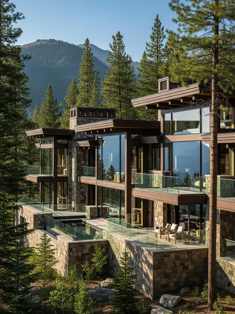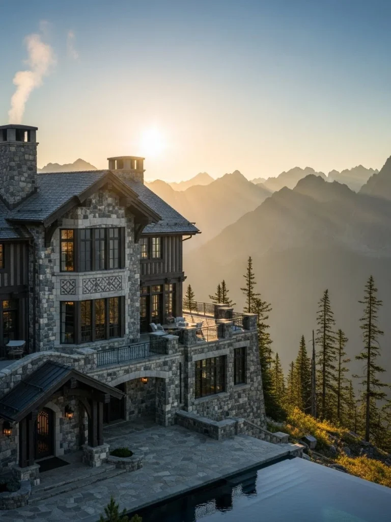 Natural stone forms the foundation of the exterior, grounding the mansion visually into the mountainside. Large glass panels open the interior to sweeping mountain views, while subtle metal detailing adds a contemporary edge. Every surface reflects careful craftsmanship and realistic texture.