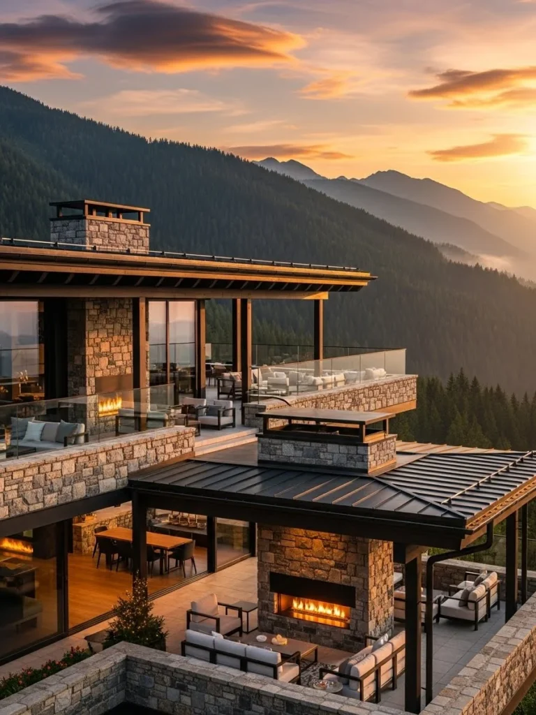 Stone and wood dominate the exterior, grounding the villa in its environment. Outdoor fireplaces provide warmth and atmosphere, enhancing realism and functionality. Terraces create seamless indoor-outdoor flow.