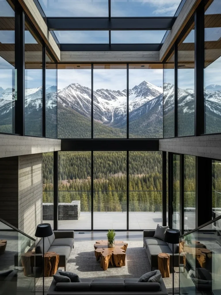 This modern mountain mansion is centered around an open glass atrium that floods the interior with natural light. The architecture emphasizes transparency and connection to the surrounding peaks. The mansion feels contemporary, refined, and expansive.