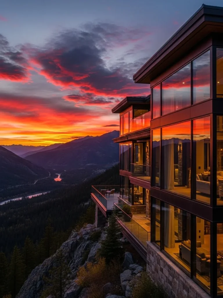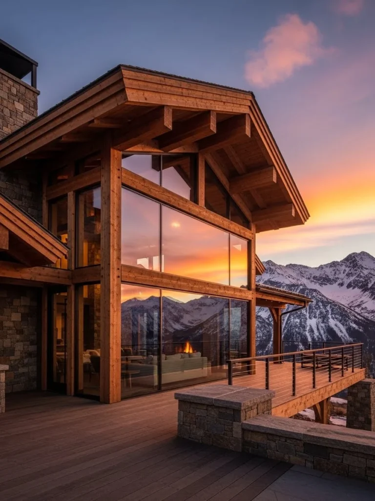 This modern rustic mountain lodge combines traditional alpine charm with contemporary luxury. Heavy timber beams, natural stone, and expansive glass walls create a warm yet sophisticated architectural style. The lodge is perfectly positioned to capture dramatic sunset views across rugged mountain ranges.
