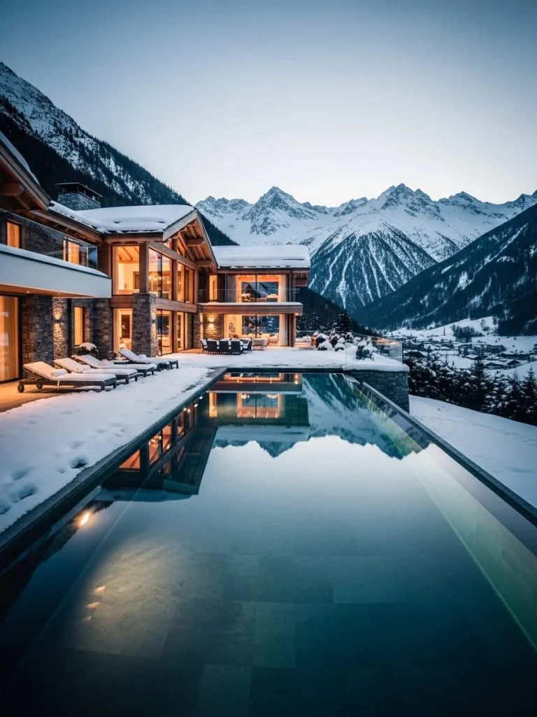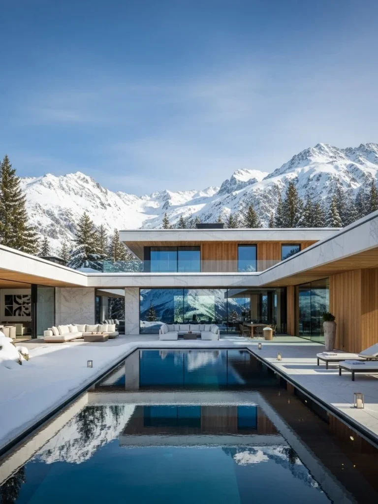 Under clear blue skies, the mansion appears pristine and timeless. Reflections dance across the pool’s surface while the mountains stand quietly in the distance, creating a sense of serene luxury and alpine grandeur.