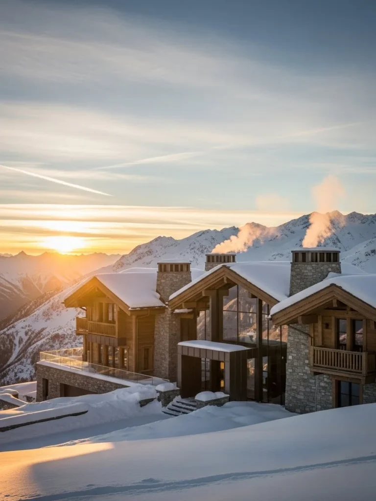 Inside, the interiors are welcoming and refined. Wood beams, stone fireplaces, and high-end finishes create a cozy yet luxurious atmosphere. Natural light fills the spaces as the sun rises over the mountains.
