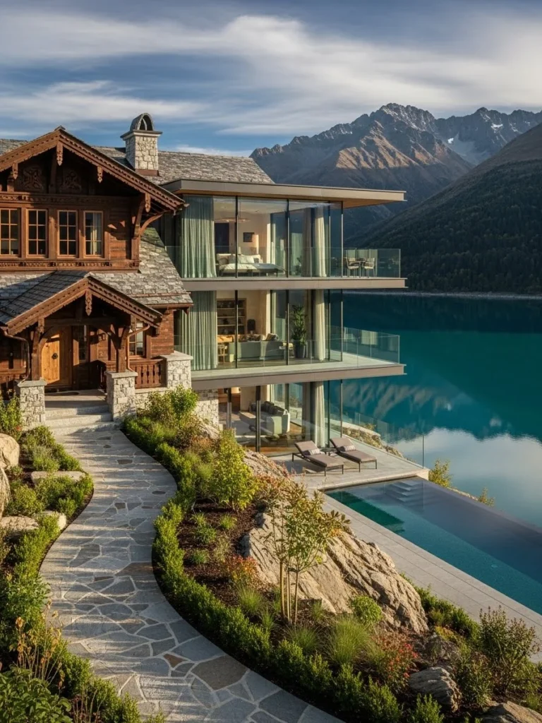Stone walls and timber details give the residence a sense of heritage, while expansive windows modernize the structure. Balconies overlook the shimmering lake below, reflecting changing skies and surrounding mountains. Every surface appears tactile and authentic.