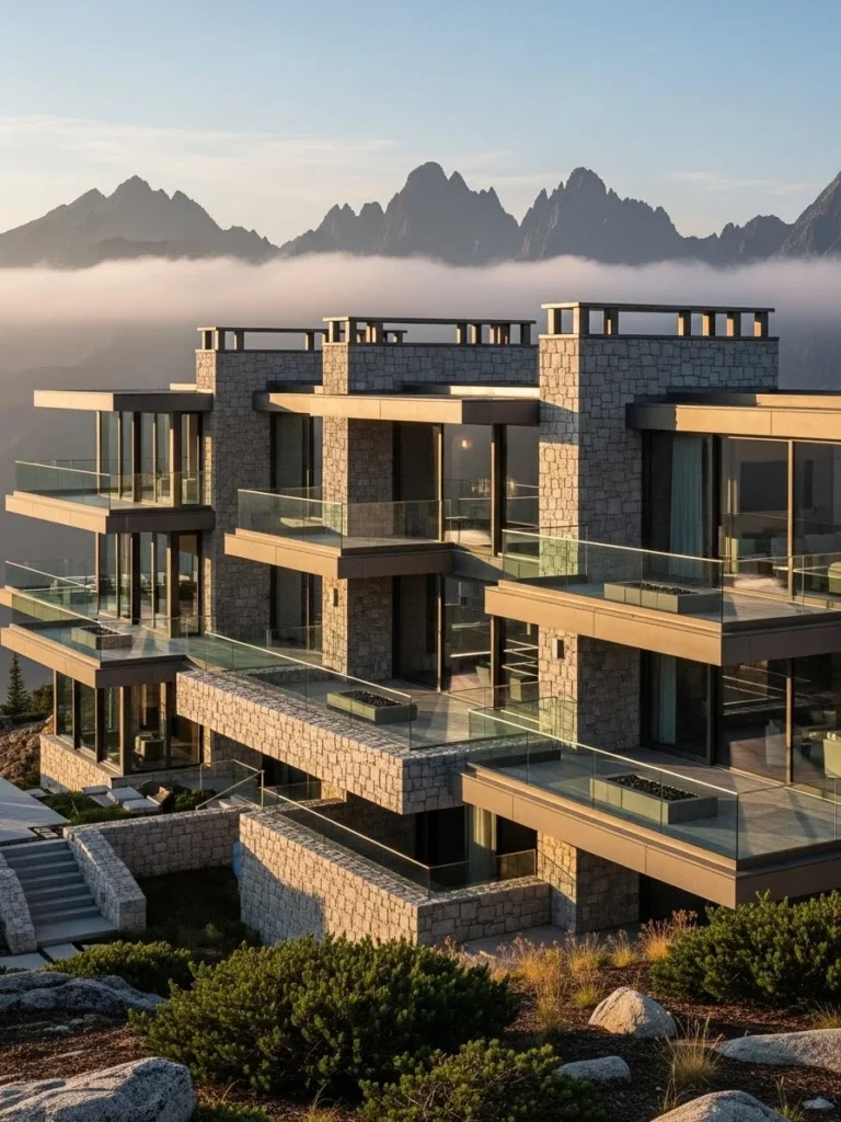 Ultra Realistic Minimalist Mountain Mansion With Natural Stone
