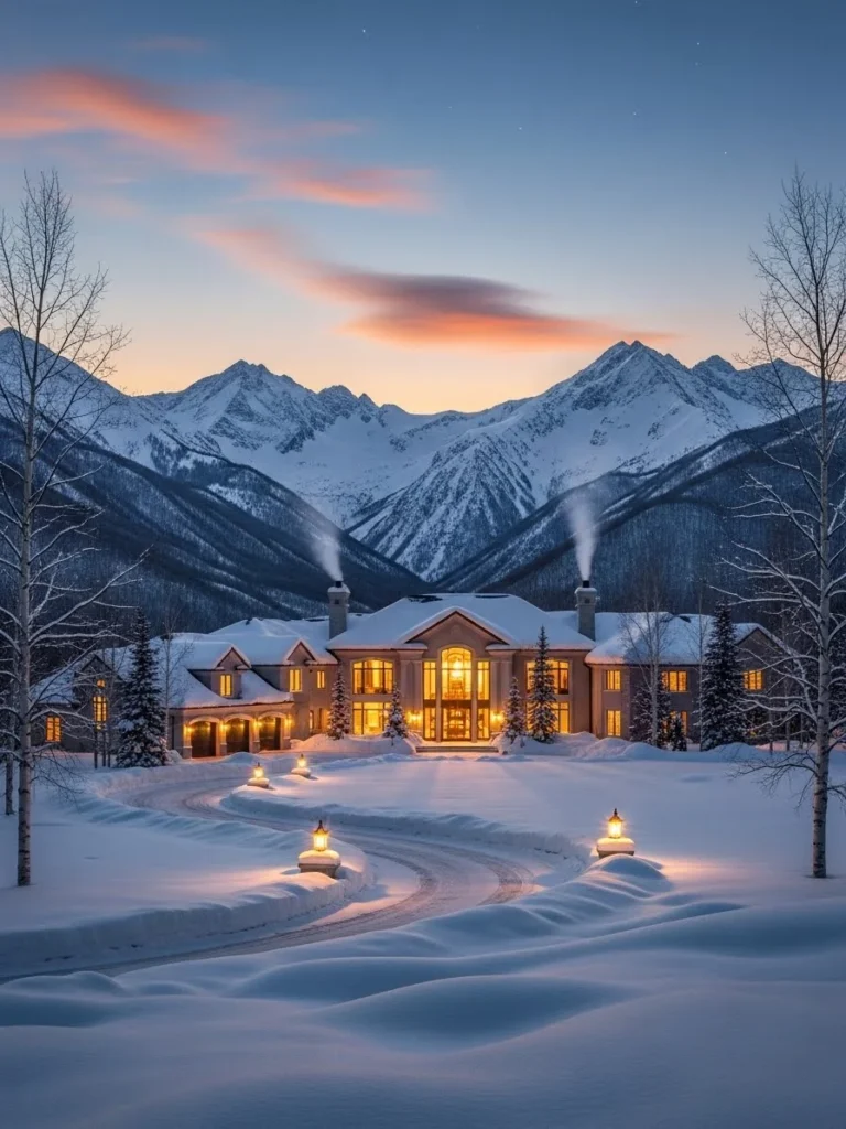 As the sky deepens in color, the mansion becomes a glowing refuge. The scene captures the essence of winter luxury—warmth, beauty, and quiet mountain solitude.