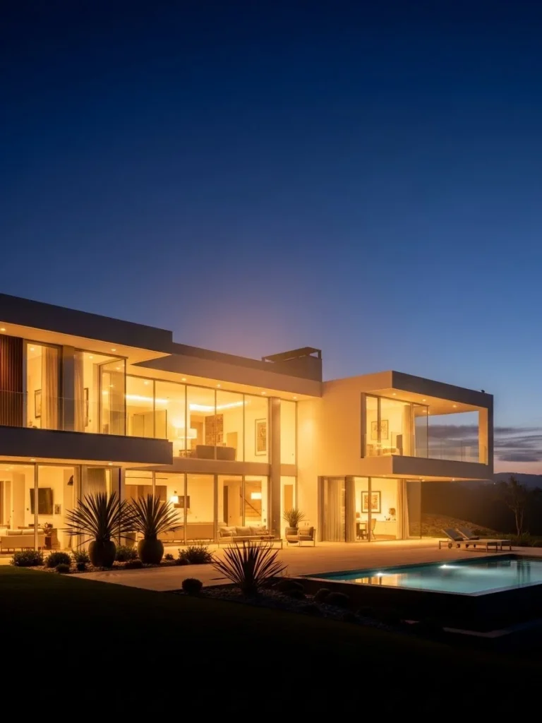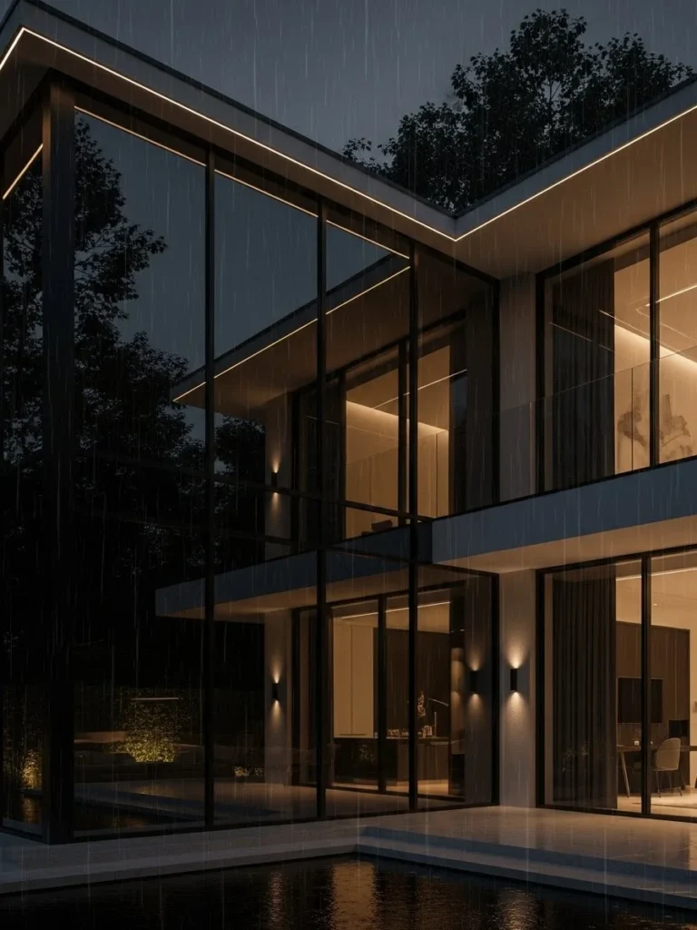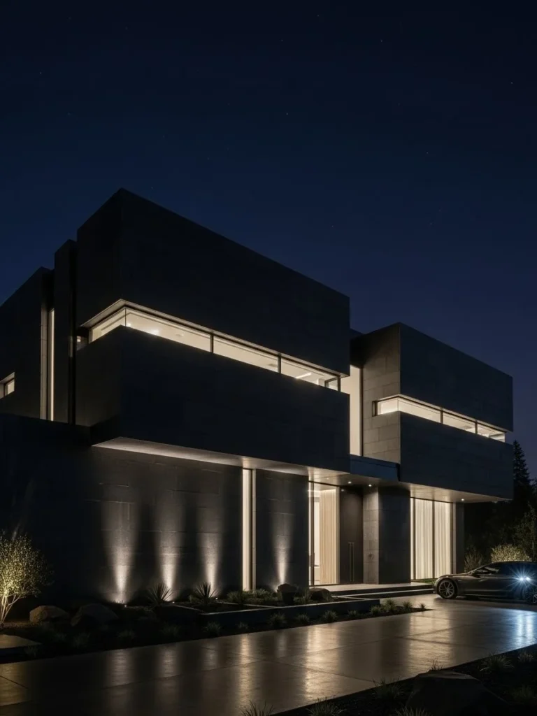 At night, glowing interior lights reveal depth and texture, while the exterior remains enigmatic. The house achieves a cinematic presence, combining privacy, serenity, and high-end modern luxury seamlessly.
